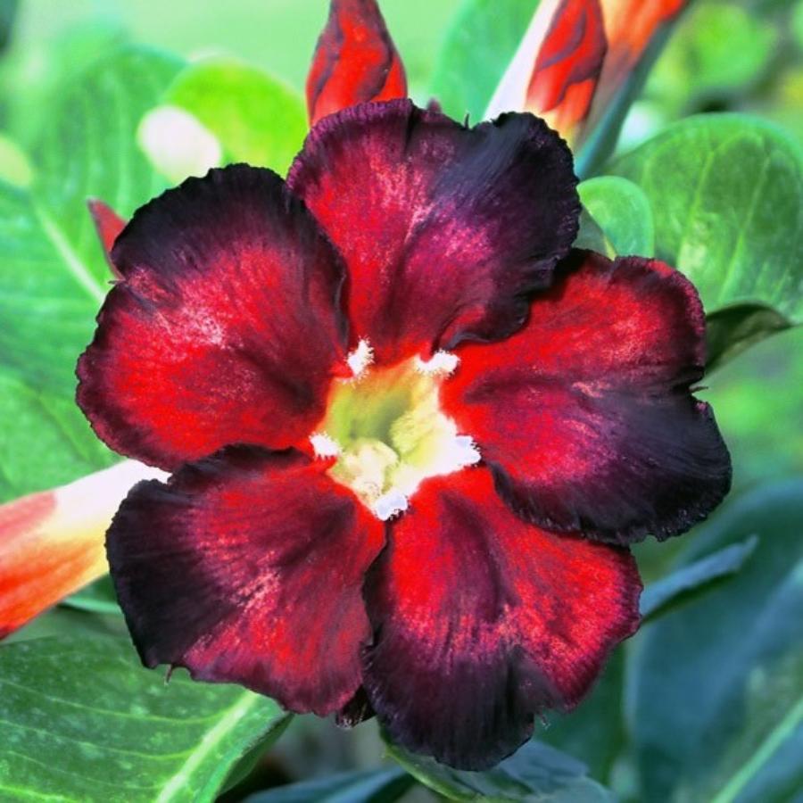 Adenium Black Fire - отличается ранним цветением и неприхотливостью в уходе. Диаметр цветка - 5-7 см. Окрас темно-красный, ближе к краям резко набирает насыщенно-темного, почти черного оттенка. Края лепестков красивые волнистые, лепестки широкие, перекрывающие друг друга. Цветение обильное.