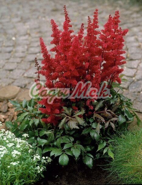 Астильба Арендса Glut - сильнорослый (до 85 см) сорт. Листья высотой - 35 см, весной буровато-красные, черешки и жилки коричневые. Соцветие ярко-карминно-красное на красноватой оси, средней плотности, длиной 35 см, метельчатое. Пыльники синеватые, тычиночные нити, пестики и чашелистики красные.