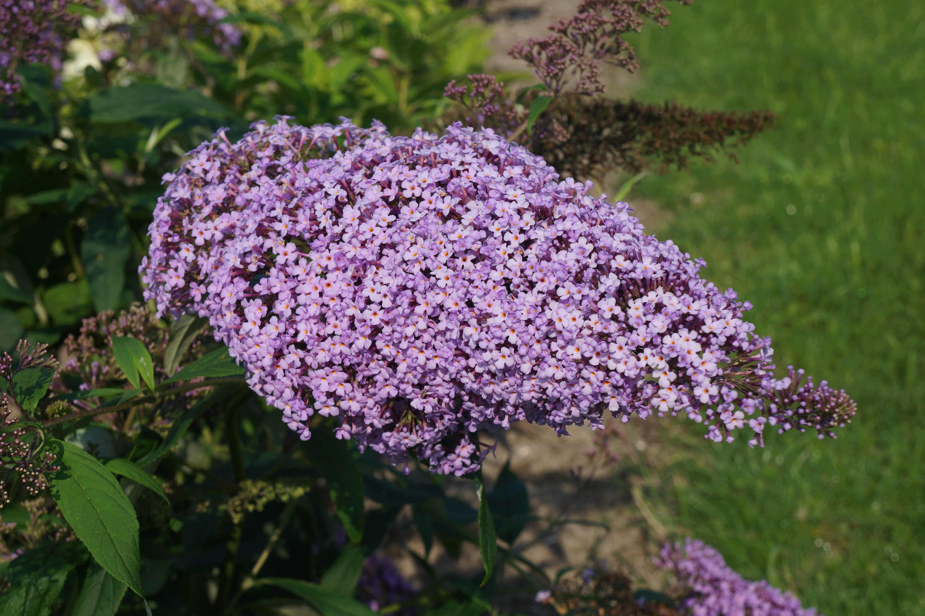 Буддлея Давида Гулливер – очень крупные колосовидные соцветия до 50 см в длину, собранные из мелких сиреневых цветков. Сам куст компактный: ширина 1,2 м, высота 1 м. Сорт с изящной светло-зеленой узкой листвой. Приятный аромат привлекает в сад пчел и бабочек. Обильно цветет с середины лета до сентября на фоне крупных опушенных листьев. Сорт зацветает на 2-3 год жизни, на зиму куст нужно хорошо укрывать. Буддлея привлекательно выглядит в сочетании с низкими кустарниками и травянистыми многолетниками. Это теплолюбивое растение предпочитает солнечное место и питательные почвы