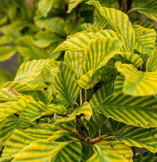 Листья довольно крупные, длиной 8-10 см, жесткие, эллиптические или яйцевидные по очертаниям, изначально светлые. зеленый весной, позже быстро становится двухцветным, полосатым, потому что между зелеными зонами, тянущимися по боковым нервам, видны резко разграниченные, широкие, желтые или желтовато-зеленые полосы; все желтоватые листья побегов можжевельника.
