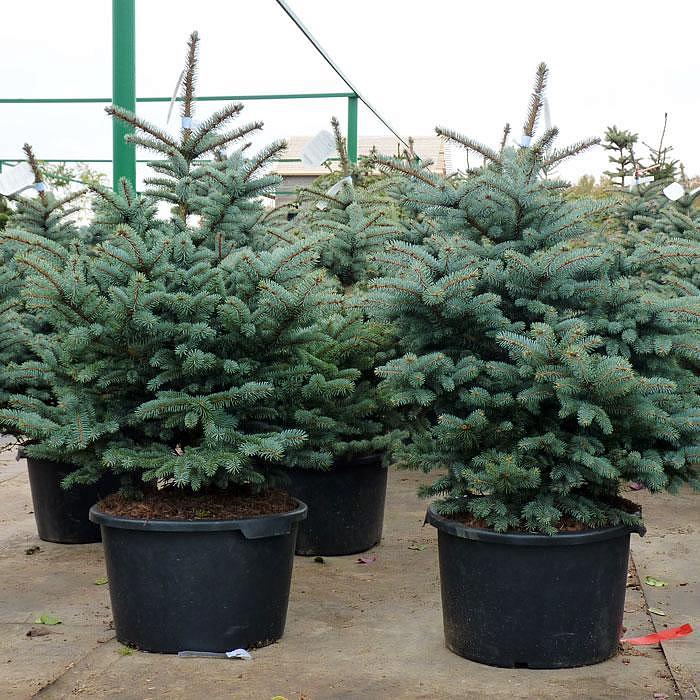 Ель колючая Kaibab (Picea Kaibab). Благодаря стройности кроны эта ель торжественна и строга. Её обычно сажают в парадной зоне сада. Достигая высоты 10-15 метров, она сохраняет правильную ярусно-пирамидальную форму без подсыхания нижних ветвей. Ветви мощные, не ломаются под тяжестью мокрого снега. Хвоя имеет оттенки от зеленого до серо-голубого. Ежегодный прирост 15-25 см. Форма кроны в молодости асимметричная, позднее ширококонусовидная, с очень густо расположенными ветвями. Ветви жесткие, отрастающие под прямым углом от ствола. Хвоя серебристо-голубая, колючая, густая, слегка серповидная, 10-12 мм длиной. Корневая система поверхностная. Прекрасно переносит пересадку во взрослом состоянии. В молодом возрасте поддается стрижке и образует непроходимые живые изгороди. Одно из главных достоинств Ели колючей то, что она не страдает от весенних заморозков и солнечных ожогов, хорошо мирится с высокими летними температурами, светолюбива. Зона зимостойкости: 4 (-35 ° С).