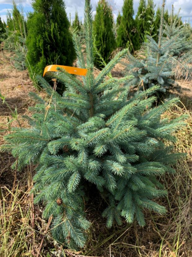 Ель колючая Kaibab (Picea Kaibab). Благодаря стройности кроны эта ель торжественна и строга. Её обычно сажают в парадной зоне сада. Достигая высоты 10-15 метров, она сохраняет правильную ярусно-пирамидальную форму без подсыхания нижних ветвей. Ветви мощные, не ломаются под тяжестью мокрого снега. Хвоя имеет оттенки от зеленого до серо-голубого. Ежегодный прирост 15-25 см. Форма кроны в молодости асимметричная, позднее ширококонусовидная, с очень густо расположенными ветвями. Ветви жесткие, отрастающие под прямым углом от ствола. Хвоя серебристо-голубая, колючая, густая, слегка серповидная, 10-12 мм длиной. Корневая система поверхностная. Прекрасно переносит пересадку во взрослом состоянии. В молодом возрасте поддается стрижке и образует непроходимые живые изгороди. Одно из главных достоинств Ели колючей то, что она не страдает от весенних заморозков и солнечных ожогов, хорошо мирится с высокими летними температурами, светолюбива. Зона зимостойкости: 4 (-35 ° С).