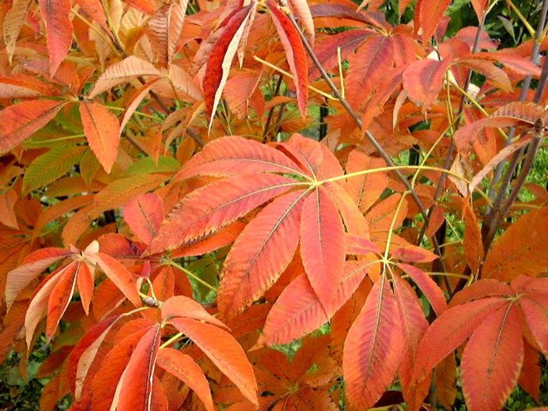 Каштан конский незамеченный. Замечательное небольшое деревце высотой 150 см. Ранние листья медного цвета, постепенно к лету становятся темно-зелеными. Осенью листва меняет окраску и переливается от желтого до оранжевого, а затем становится ярко-красного цвета. Цветет в мае-июне бело-кремовыми цветочками, собранными в прямостоячие пирамидальные кистевые соцветия. Место посадки - солнце-полутень. Используется в одиночных, солитерных посадках.