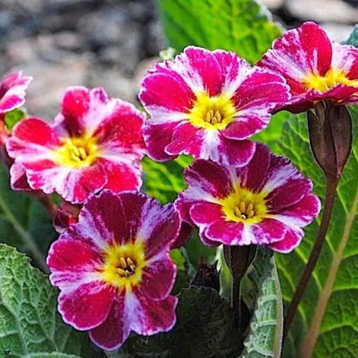 Примула гибридная Дарк Розалин - высота растения 15 см. Цветок малиново-красный с желтой серединой. Большого ухода примулы не требуют. В рыхлой земле быстрее образуются корни у молодых розеток. В течение вегетационного сезона растения подкармливают три раза. Первую подкормку проводят рано весной, вторую — через 2—3 недели, третью — в конце июля—середине августа фосфорно-калийными удобрениями. Примула гибридная Дарк Розалин очень отзывчива на внесение навозной жижи в течение вегетационного сезона. Ежегодно под кустики примул подсыпают 2—3 см рыхлой питательной земли, а еще лучше этим слоем покрыть всю площадь, занятую растениями.