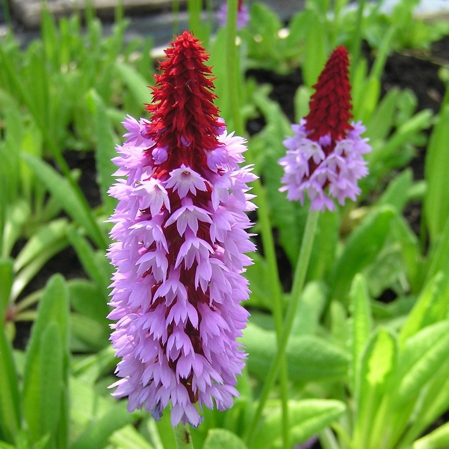 Примула Виаля (орхидной) удивит даже цветоводов с многолетним опытом. С первого взгляда никто и не скажет, что это действительно примула. Оригинальные остроконечные соцветия длиной до семи сантиметров состоят из колокольчатых бутонов ярко-красного цвета. Процесс раскрытия начинается снизу, когда бутоны постепенно превращаются в ароматные небольшие цветки лавандово-сиреневого оттенка, из-за чего все соцветие выглядит двухцветным. Примула Виаля идеально подходит для оформления альпийских горок, рокариев и небольших клумб. При этом цветение длится около пяти недель.