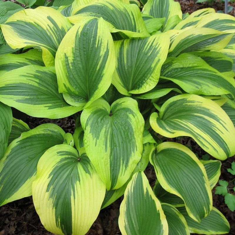 Хоста Aureomarginata– яркое, оригинальное растение, неоднократно меняющее свою окраску в течение всего вегетационного периода. Ранней весной лист очень нарядный – ярко-золотой в середине и окаймленный ланцетовидной яркой зеленой полосой. Летом кайма выгорает, и он становится кремовым, с глубоко прорезанными зелеными прожилками, а ближе к осени – салатным, но узкая темно-сине-зеленая полоска остается. Цветет растение долго и продолжительно, раскрывая темно-пурпурные цветы на высоких цветоносах. Чтобы сохранить такую красочность, многолетник желательно высаживать на светлых и некислых почвах. Сорт не требует укрытия, любит влажные, богатые гумусом участки.