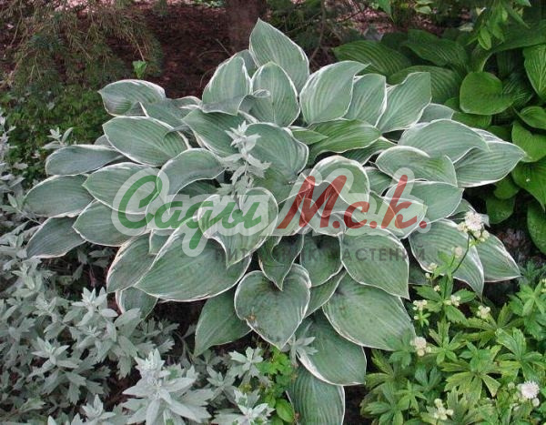 Хоста Love Pat. Листья у этого сорта очень крупные, широкие, практически круглые, ребристые, насыщенного сине-голубого цвета, сильно жатые, текстурированные, чашевидной формы. Куст растёт в виде большой эффектной куртины, густой, мощный, высотой до 50-70см. Цветет в июле обильно и продолжительно, крупными, почти белыми цветами без аромата.