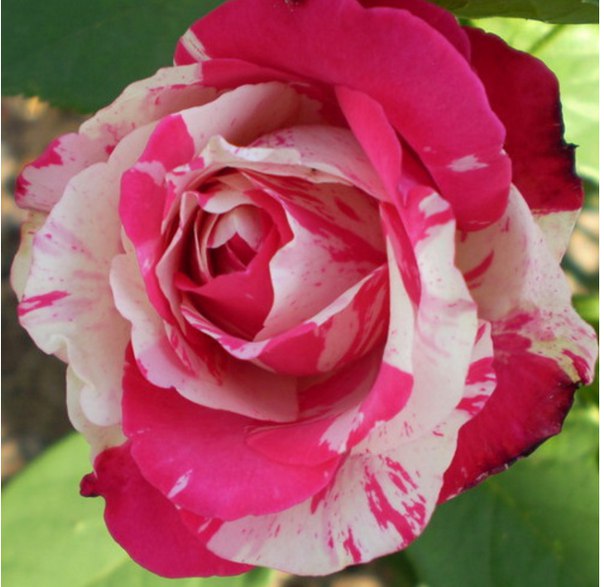 Роза Satina отличается яркой оригинальной расцветкой лепестков - сочетание яркого красно-малинового цвета с белыми полосками и легким ароматом. Бутон кремовый с красно-малиновыми полосами, высокий (8-10 см), цветок пестрый, махровый (35-45 лепестков). Цветки до 10 см в диаметре. Цветение обильное, повторное. Высота куста 80- 90 см. Листья темно-зеленые, блестящие.